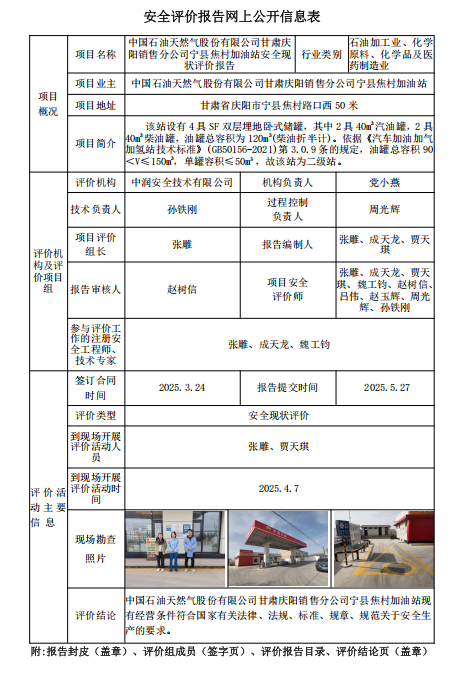 中國石油天然氣股份有限公司甘肅慶陽銷售分公司寧縣焦村加油站安全現(xiàn)狀評價報告